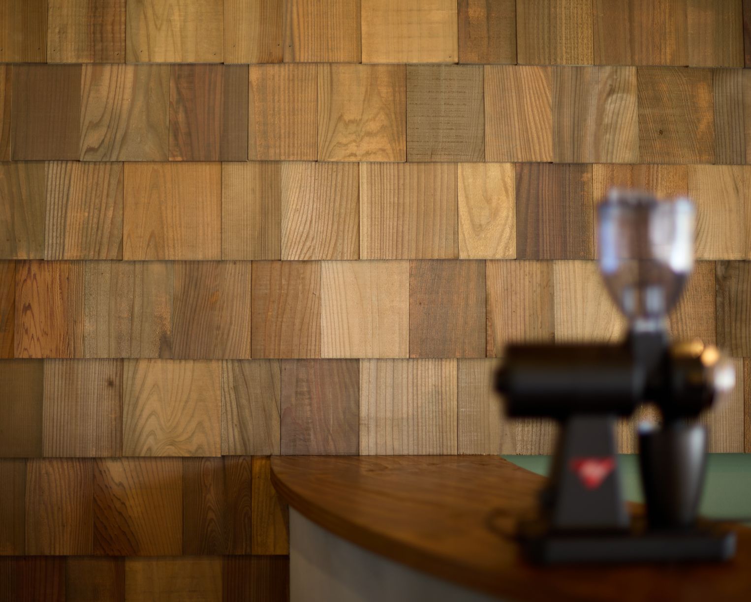 木の温もりと自然な不均一さを大切にするため、5つのサイズの板材を組み合わせてユニット化。